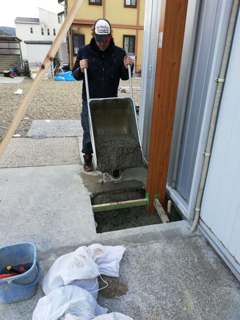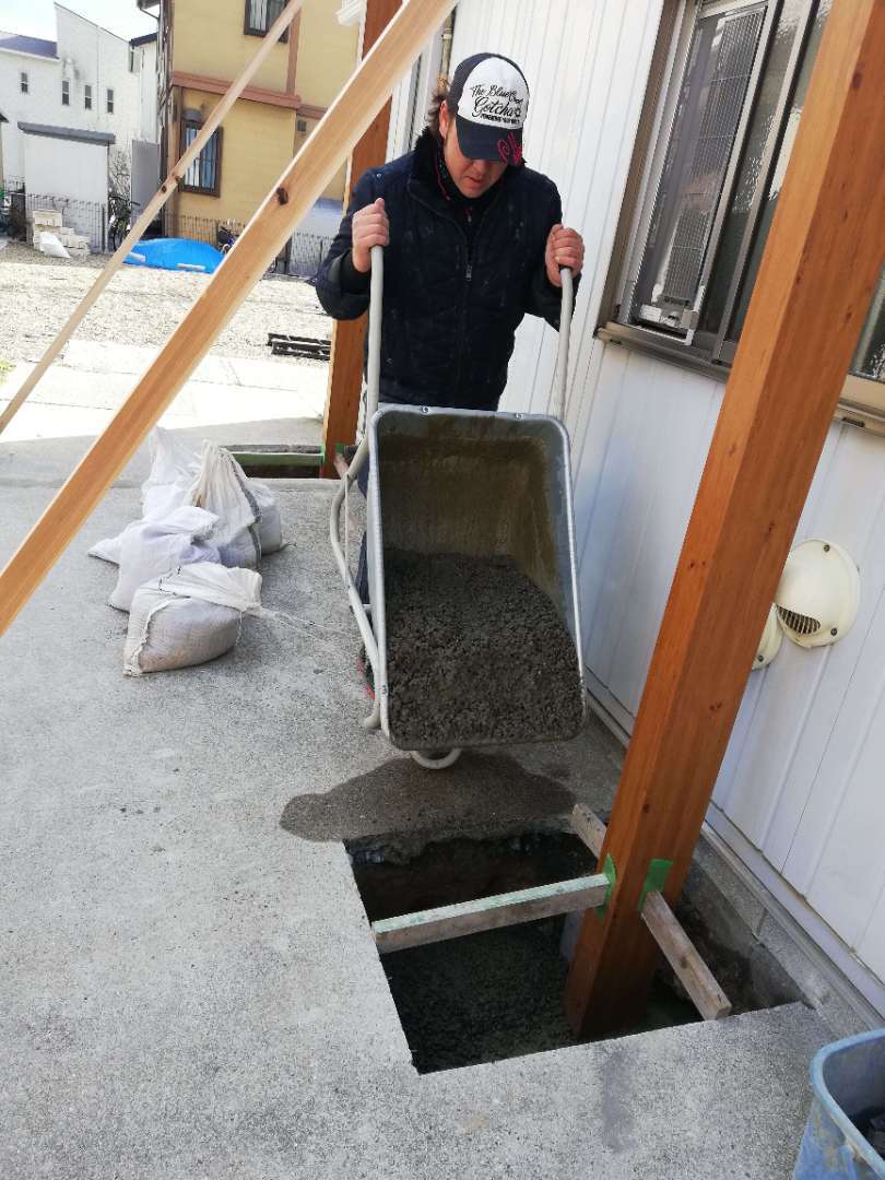 その後カーポートが倒れてしまわないように、基礎コンクリートの打設を行います。